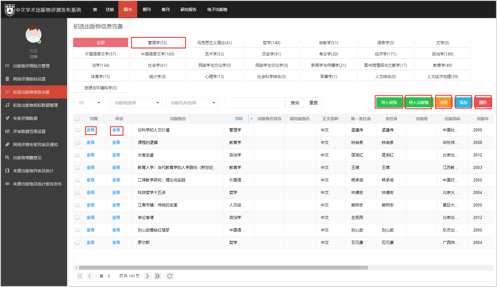 ▲ 出版物綜合管理:包括出版物初選、設(shè)置評(píng)測(cè)專家、設(shè)置出版物評(píng)測(cè)參數(shù)、出版物指標(biāo)數(shù)據(jù)整理、出版物信息統(tǒng)計(jì)發(fā)布等。
