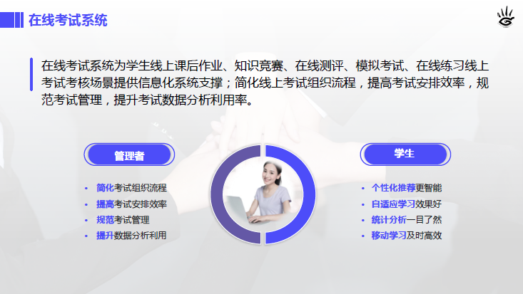 AI考試系統(tǒng)采用一平兩端,數(shù)據(jù)同步的方式,實現(xiàn)微信端和電腦端的題庫系統(tǒng),在線考試、在線閱卷等功能。系統(tǒng)支持整個在線題庫發(fā)布、在線測試和作業(yè)發(fā)布、交流互動、成績評測和學習成果反饋教學流程等功能,主要包括在線考試系統(tǒng)、在線閱卷系統(tǒng)、AI在線考試、AI在線閱卷。