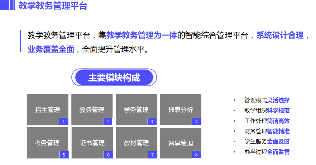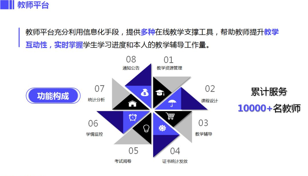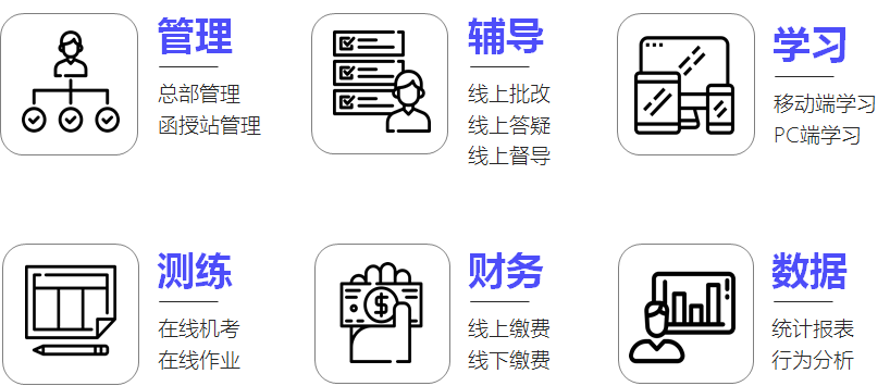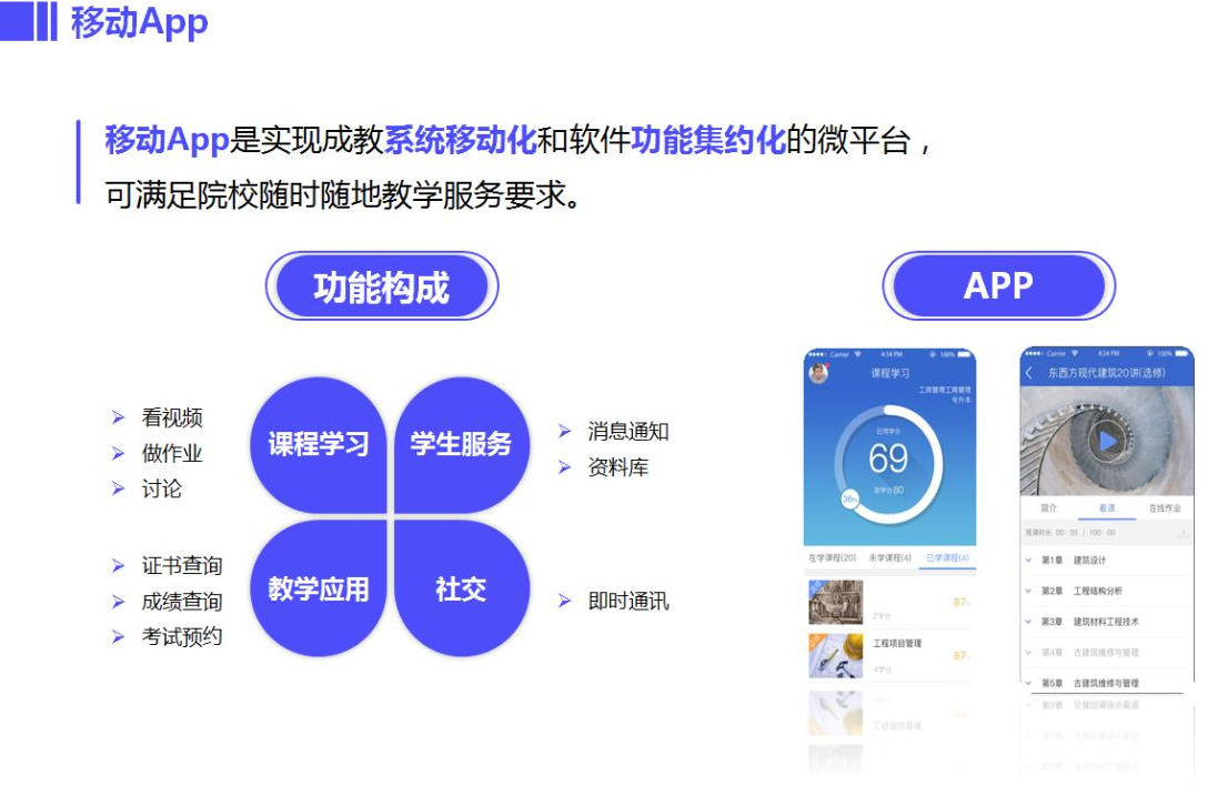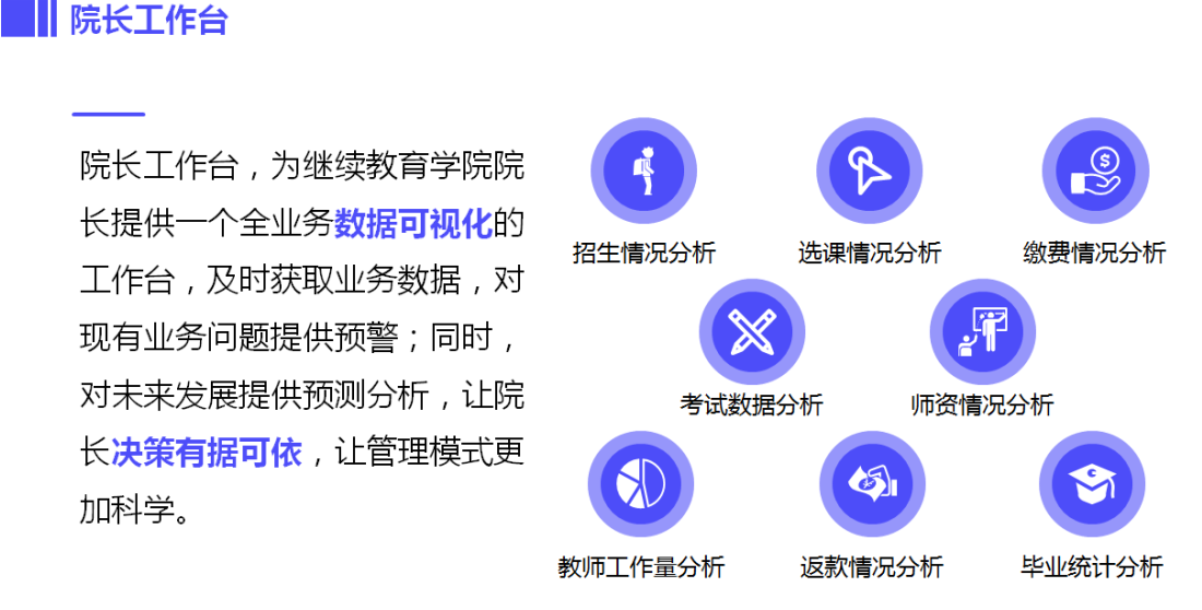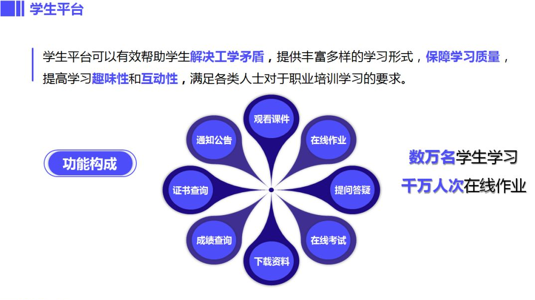繼續(xù)教育信息化管理平臺(tái)是面向成教、函授等各類辦學(xué)主體,應(yīng)用大數(shù)據(jù)、云計(jì)算、移動(dòng)化、自適應(yīng)等信息技術(shù),提供幫助院校規(guī)范教務(wù)管理、優(yōu)化教學(xué)模式、開(kāi)發(fā)教學(xué)資源、提升教學(xué)績(jī)效的模塊化信息系統(tǒng)。系統(tǒng)具有規(guī)范的業(yè)務(wù)流程管理、統(tǒng)一的教育組織管理、及時(shí)的業(yè)務(wù)信息反饋和完善的數(shù)據(jù)分析報(bào)告。系統(tǒng)流程簡(jiǎn)化、功能易用、角色齊全、數(shù)據(jù)互通。